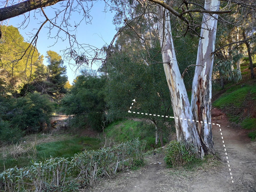 En este caso, la entrada al sendero se sitúa a la izquierda de la residencia militar, en concreto cruzando la zona verde que da acceso al arroyo Teatinos. Desde ahí, avanzaremos por el sendero, dejando un pequeño puente a nuestra izquierda.